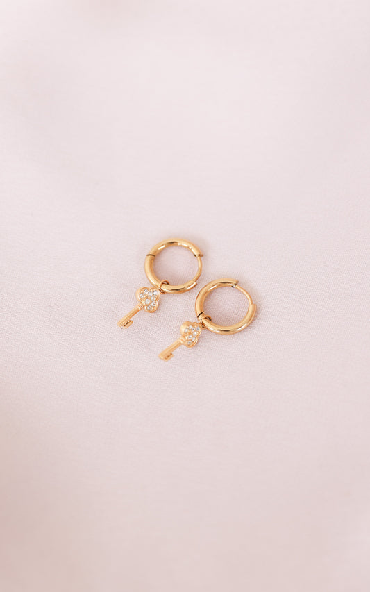 Akito Dainty Hoop Charm Earrings - Gold Key Diamante