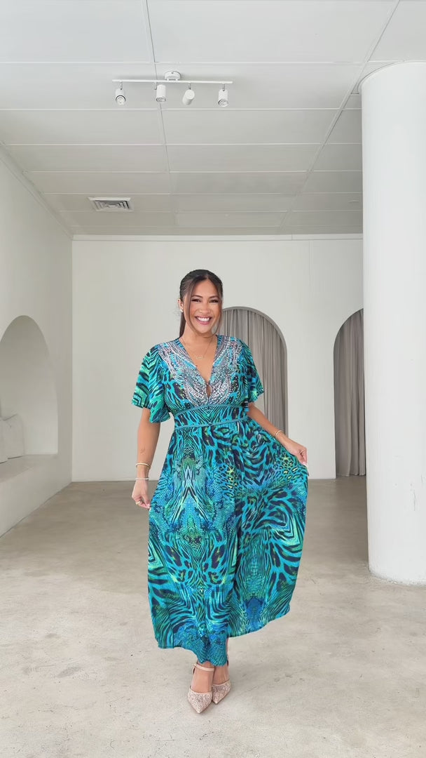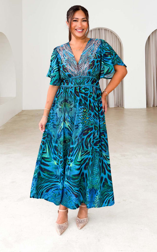 Celise Gem Embellished Maxi Dress - Blue Leopard Snake Print