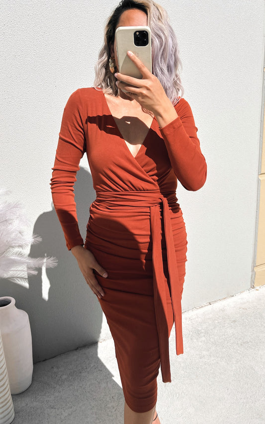 Aston Long Sleeve Midi Dress - Rust