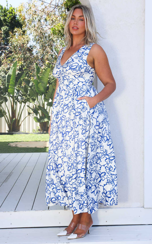 Aretha Sleeveless Maxi Dress - White Blue Floral