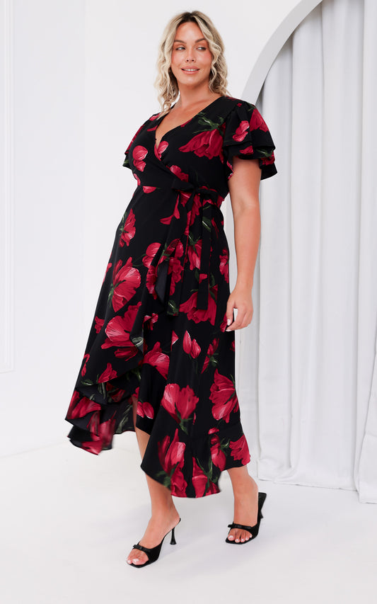 Odette Short Sleeve Wrap Maxi Dress - Black Floral