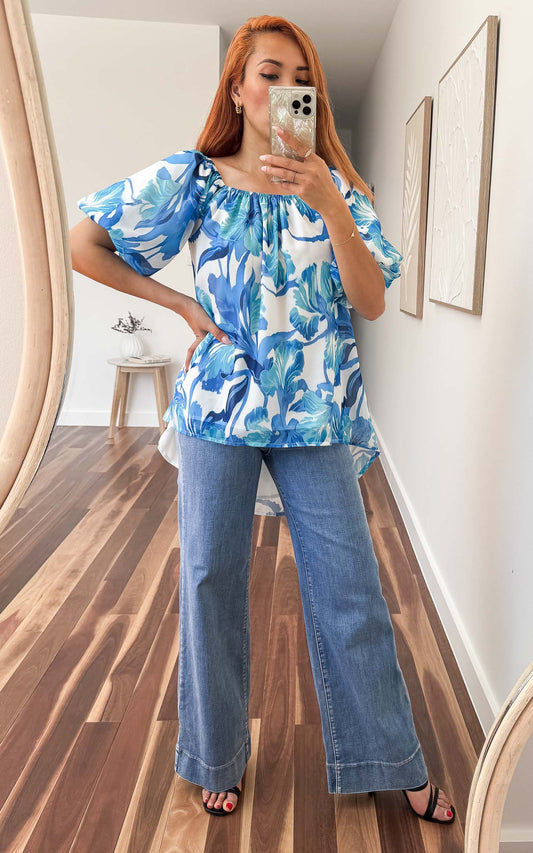 Myrtle Top - White Blue Floral