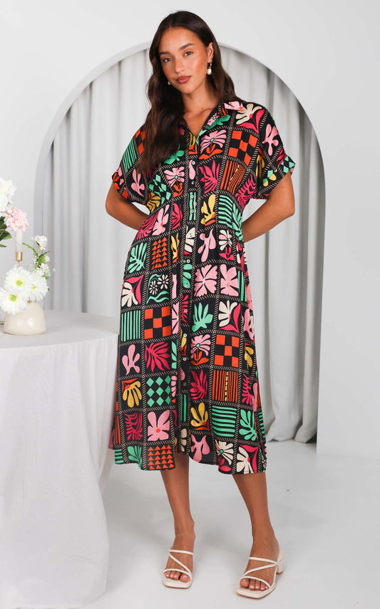 Rainier Midi Dress - Black Multi Print