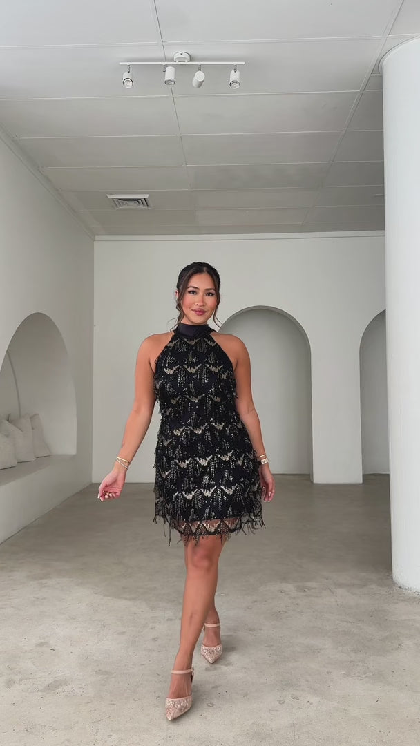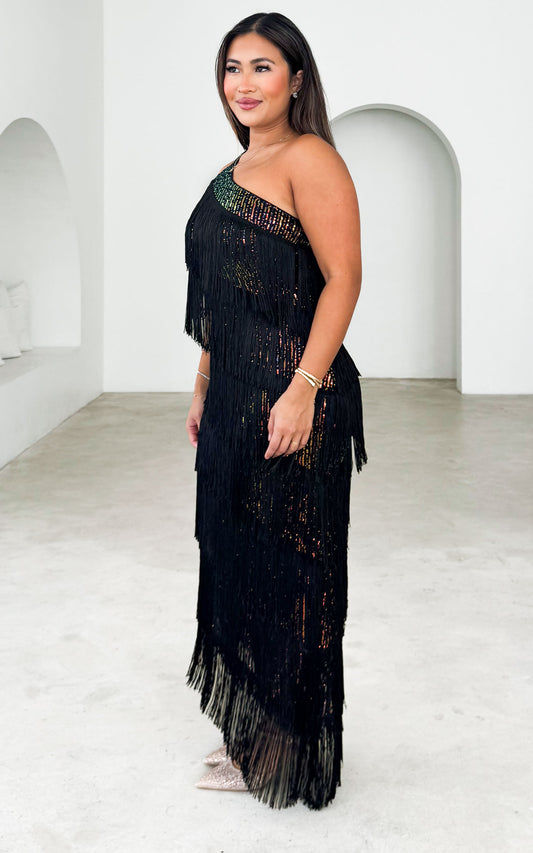Gatsby Fringe Tassel Midi Dress - Black Rainbow Sequin