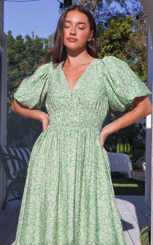 Monique Maxi Dress - Green Leaf Print