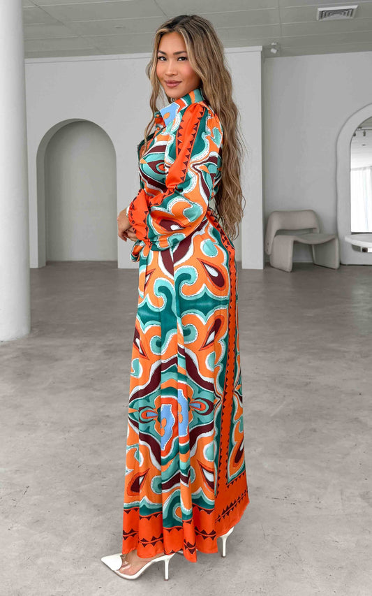 Augustine Long Sleeve Maxi Dress - Orange Green Multi Print