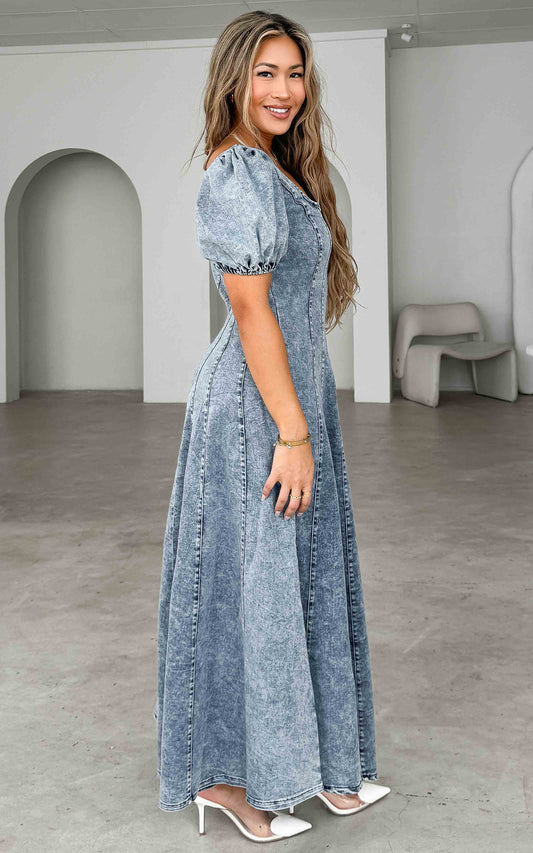 Kartford Puff Sleeve Denim Maxi Dress - Blue