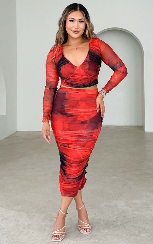 Melody Mesh Midi Skirt - Red Black Abstract Print