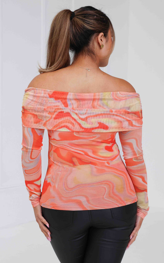 Melody Long Sleeve Mesh Crop Top - Red Black Abstract Print