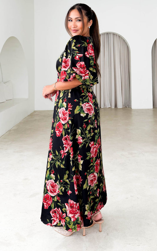 Liora Short Sleeve Maxi Dress - Black Red Floral