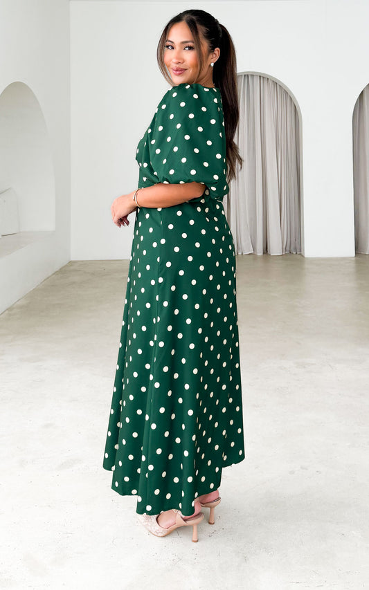 Liora Short Sleeve Maxi Dress - Emerald Cream Polka Dot