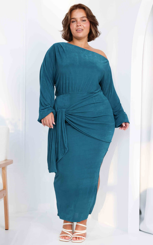 Kobe Long Sleeve Midi Dress - Teal Blue Sheen