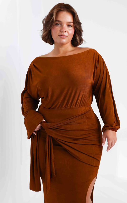 Kobe Long Sleeve Midi Dress - Rust Sheen