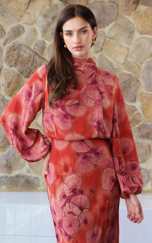 Cobero Long Sleeve Maxi Dress - Orange Purple Floral