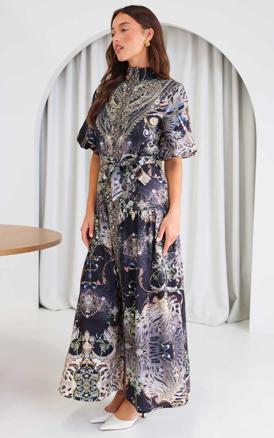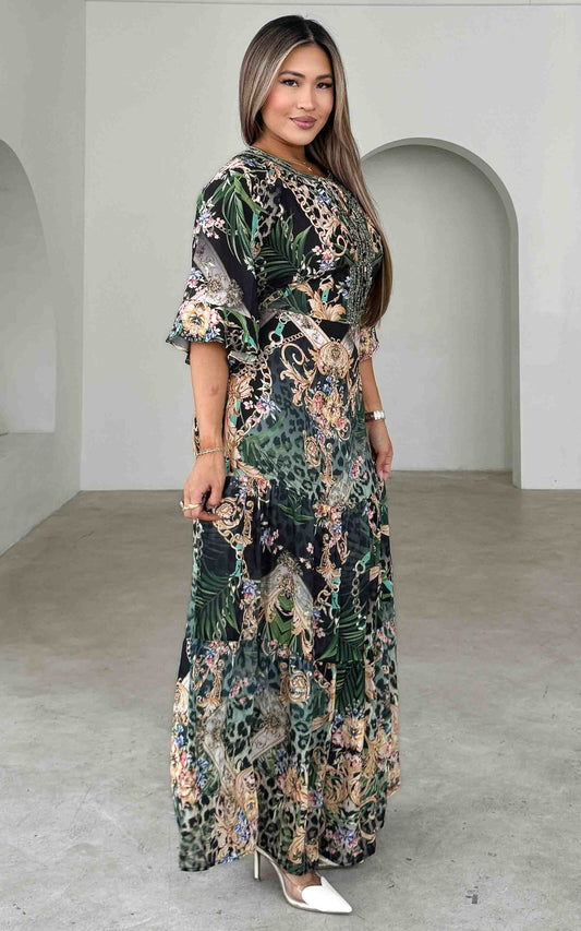 Jocosa Gem Embellished Maxi Dress - Black Green Multi Print
