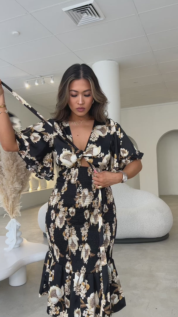 – Tie up bust closure on the front, creates a cut out detail underneath where the tie sits