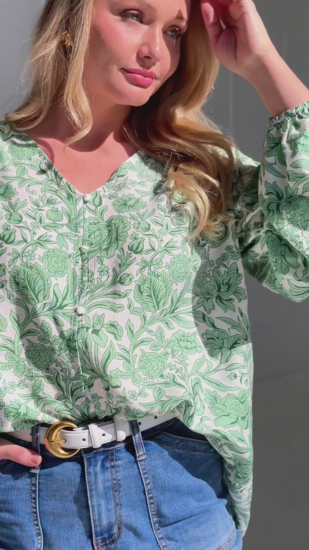 – Colour: white base with green print. This green is slightly darker than Doneth Dress (print placement may vary with each piece)