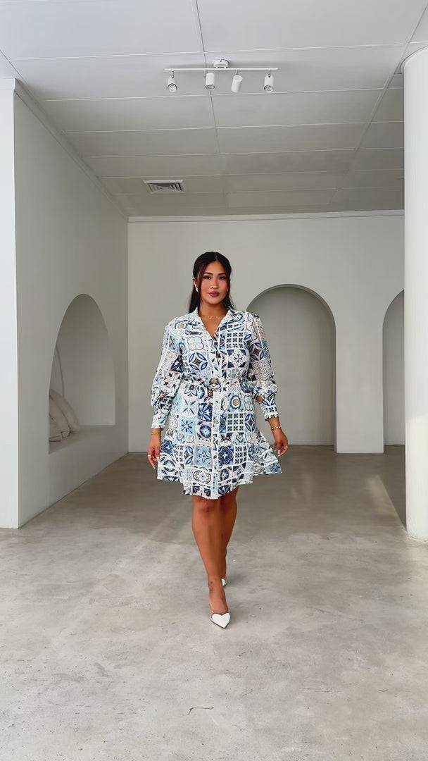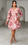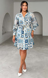 – White trim detailing along collar, button placket seam, sleeves and skirt hem