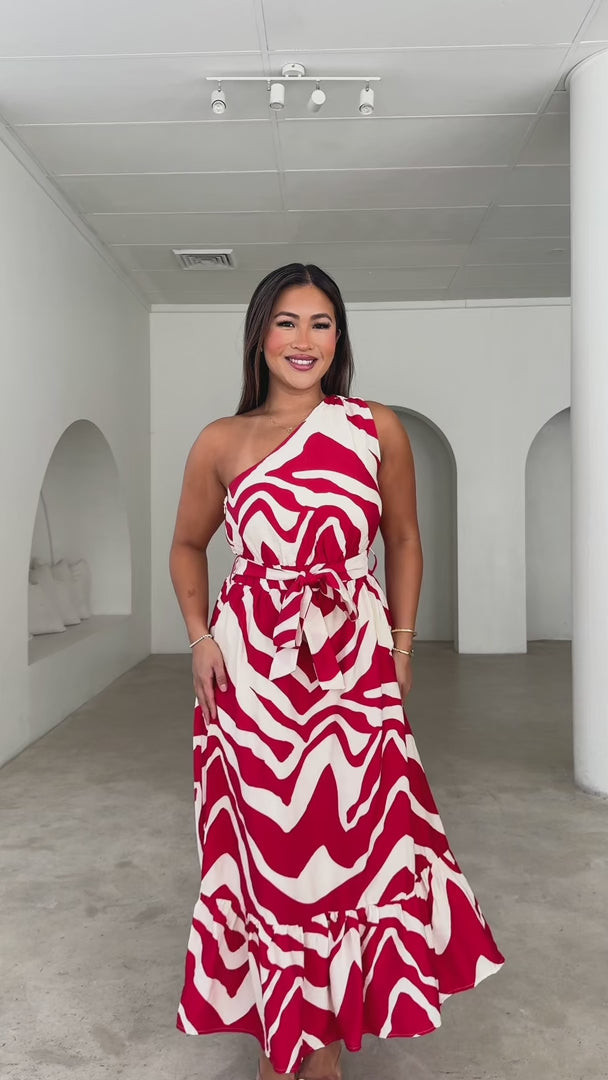 – Colour: red and cream abstract print (print placement may vary with each piece)