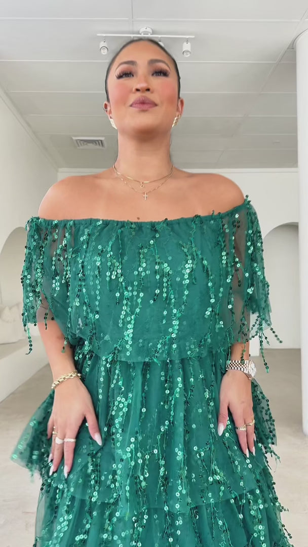 – Colour: emerald base with emerald sequin tassels (sequin placement may vary with each piece)