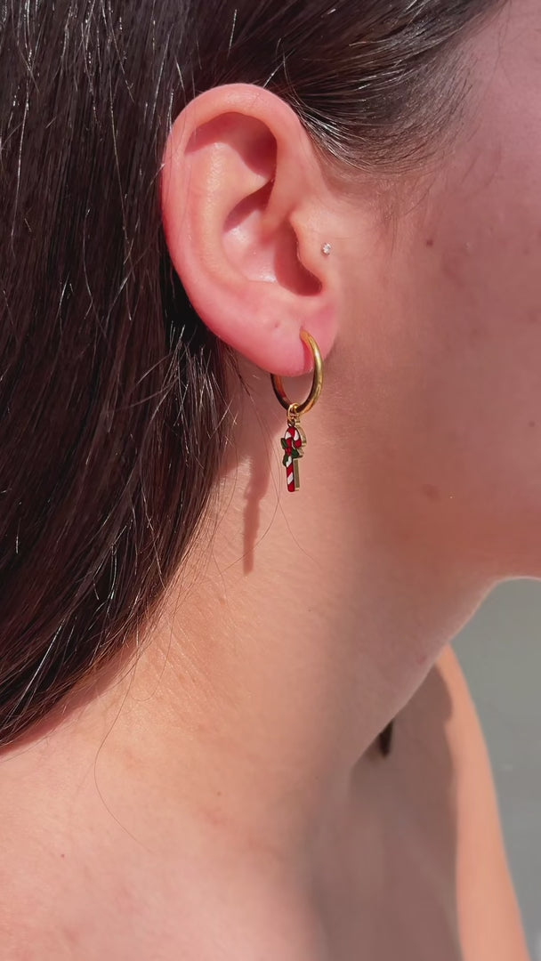 Festive Hoop Charm Earrings - Gold Candy Cane