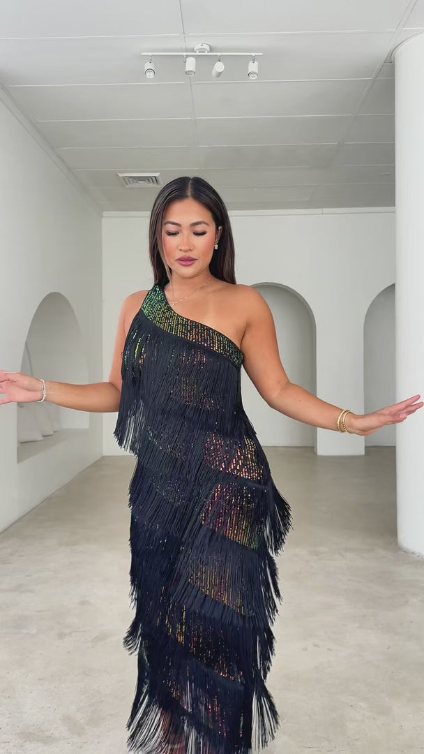 Gatsby Fringe Tassel Midi Dress - Black Rainbow Sequin