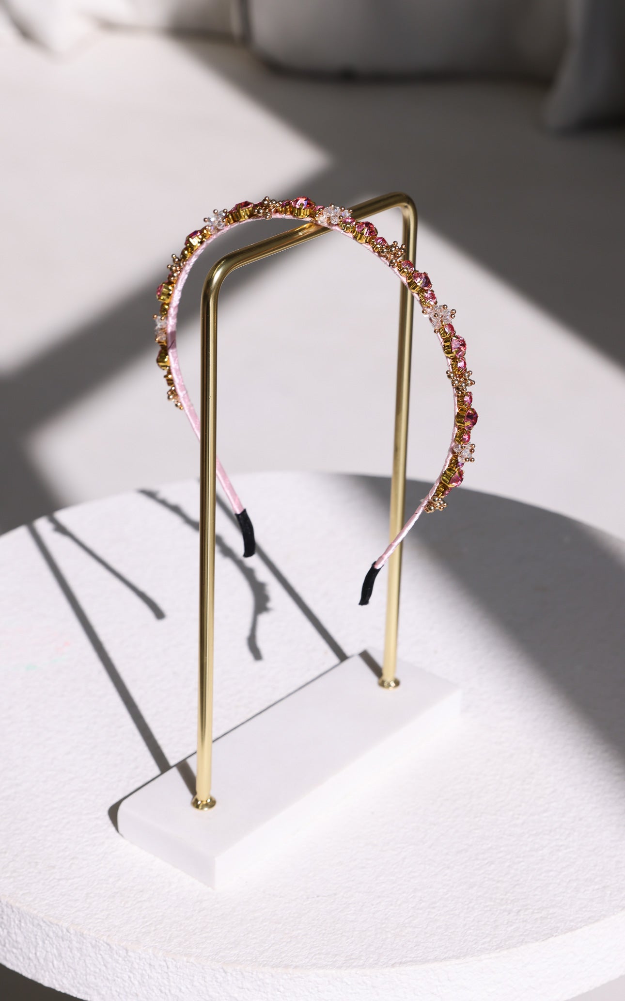 – Colour: pink ribboning around the band with pink diamantes and mixed clear and gold coloured beads