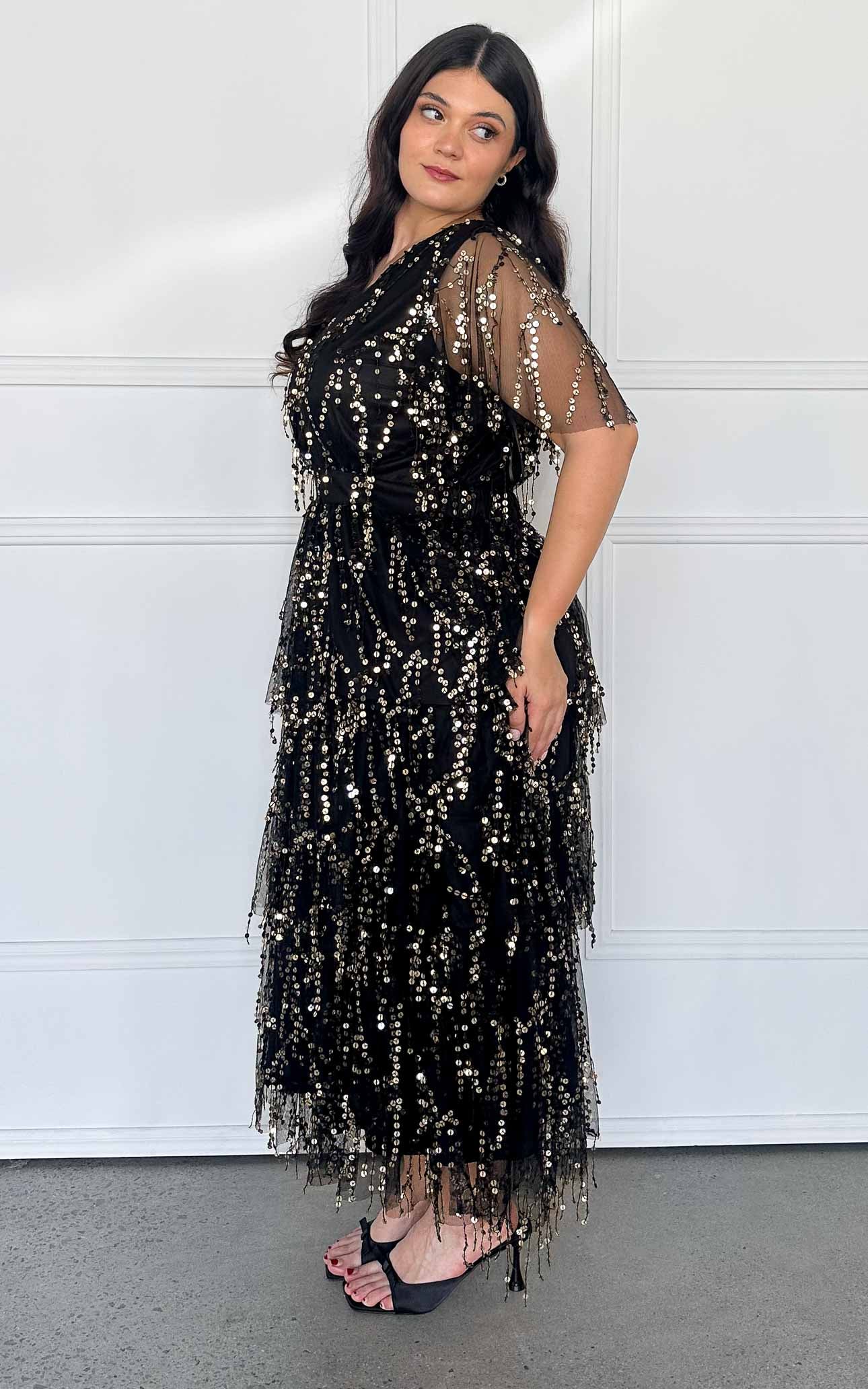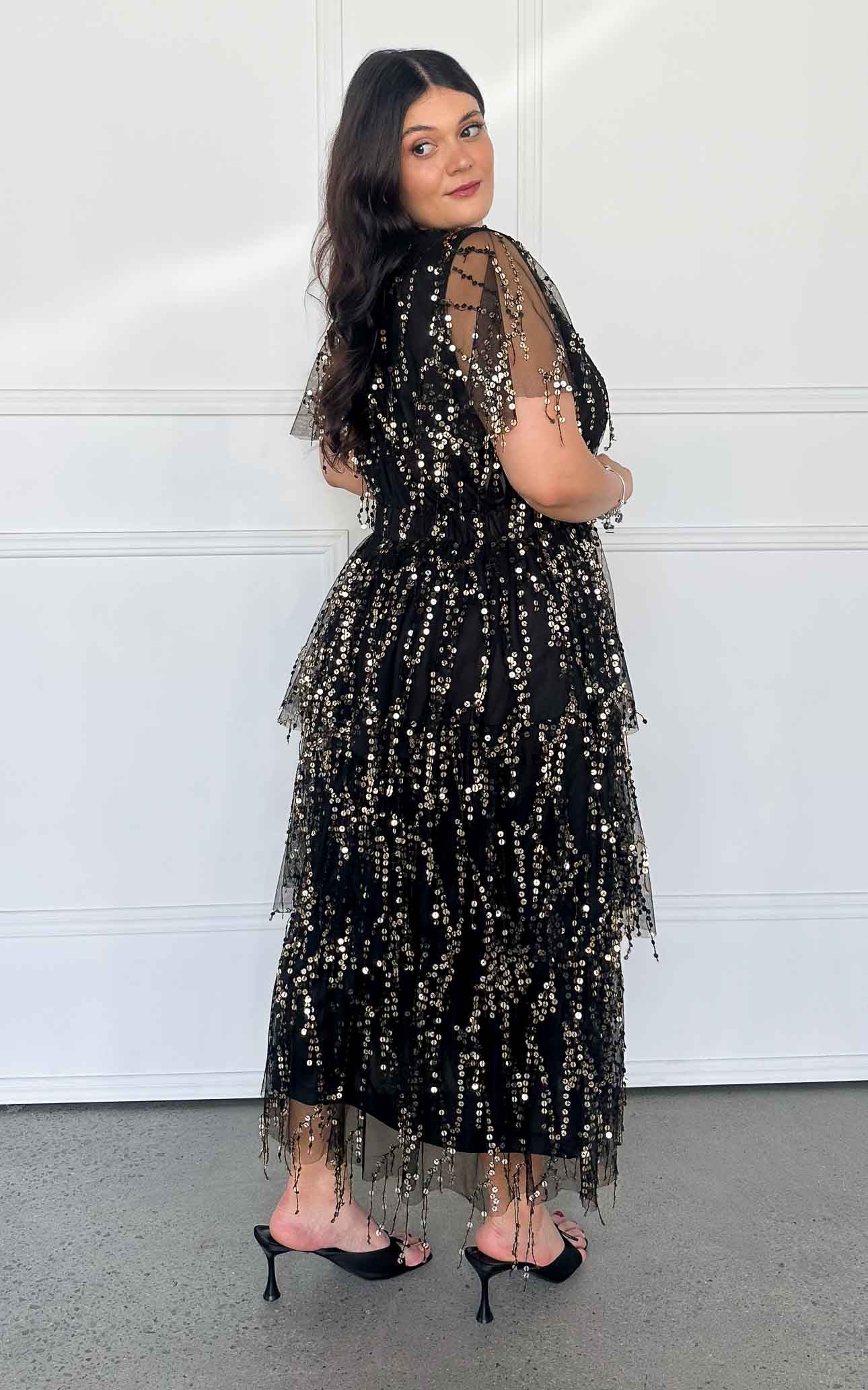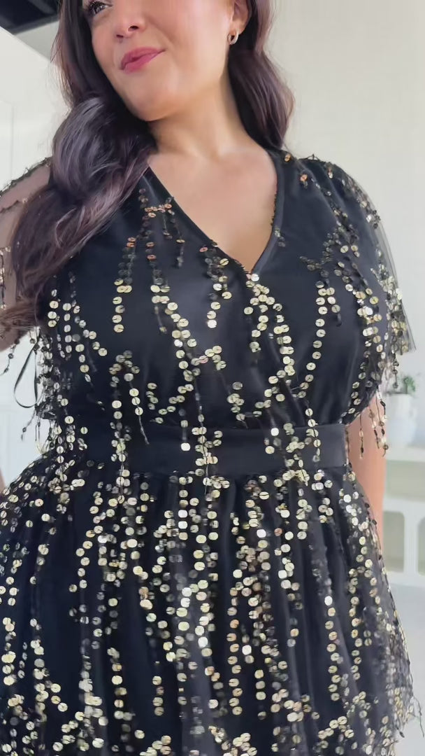 – Colour: black base with gold sequin tassels (sequin placement may vary with each piece)