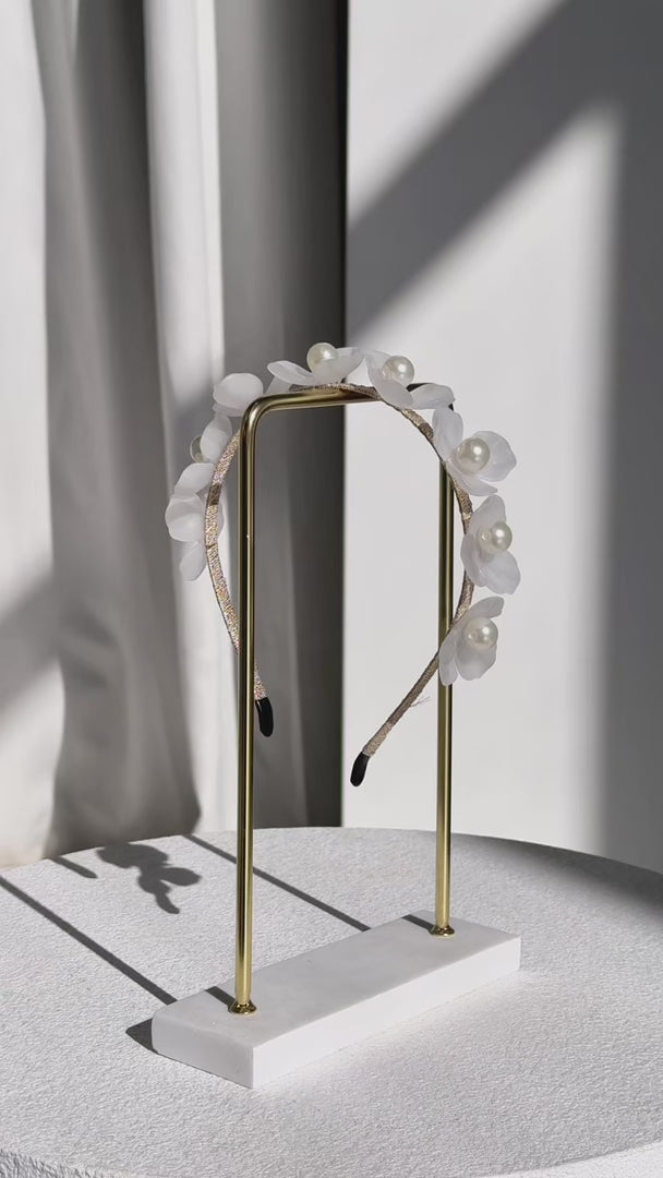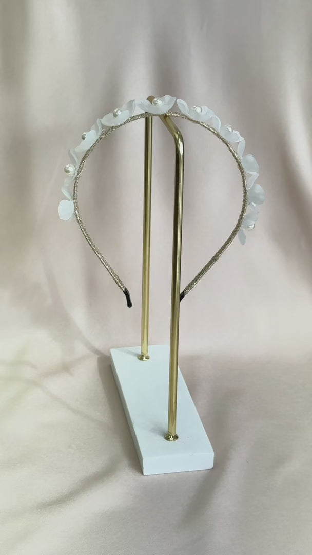 – Colour: gold ribboning around the band with matte frost white acrylic flowers and faux pearls