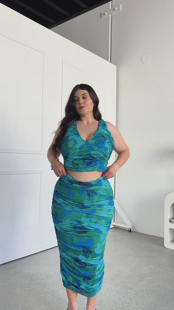 Melody Sleeveless Mesh Crop Top - Green Blue Print
