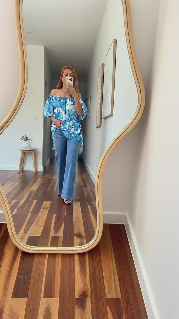 – Colour: white base with blue floral print (print placement may vary with each piece)