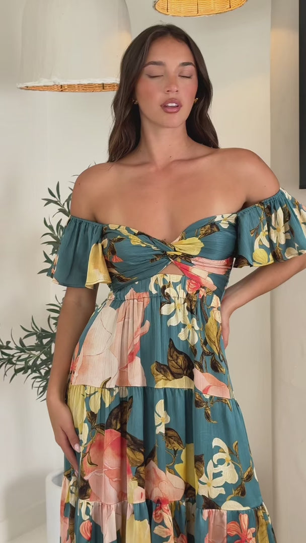 Odessey Shirred Back Panel Maxi Dress - Teal Green Floral