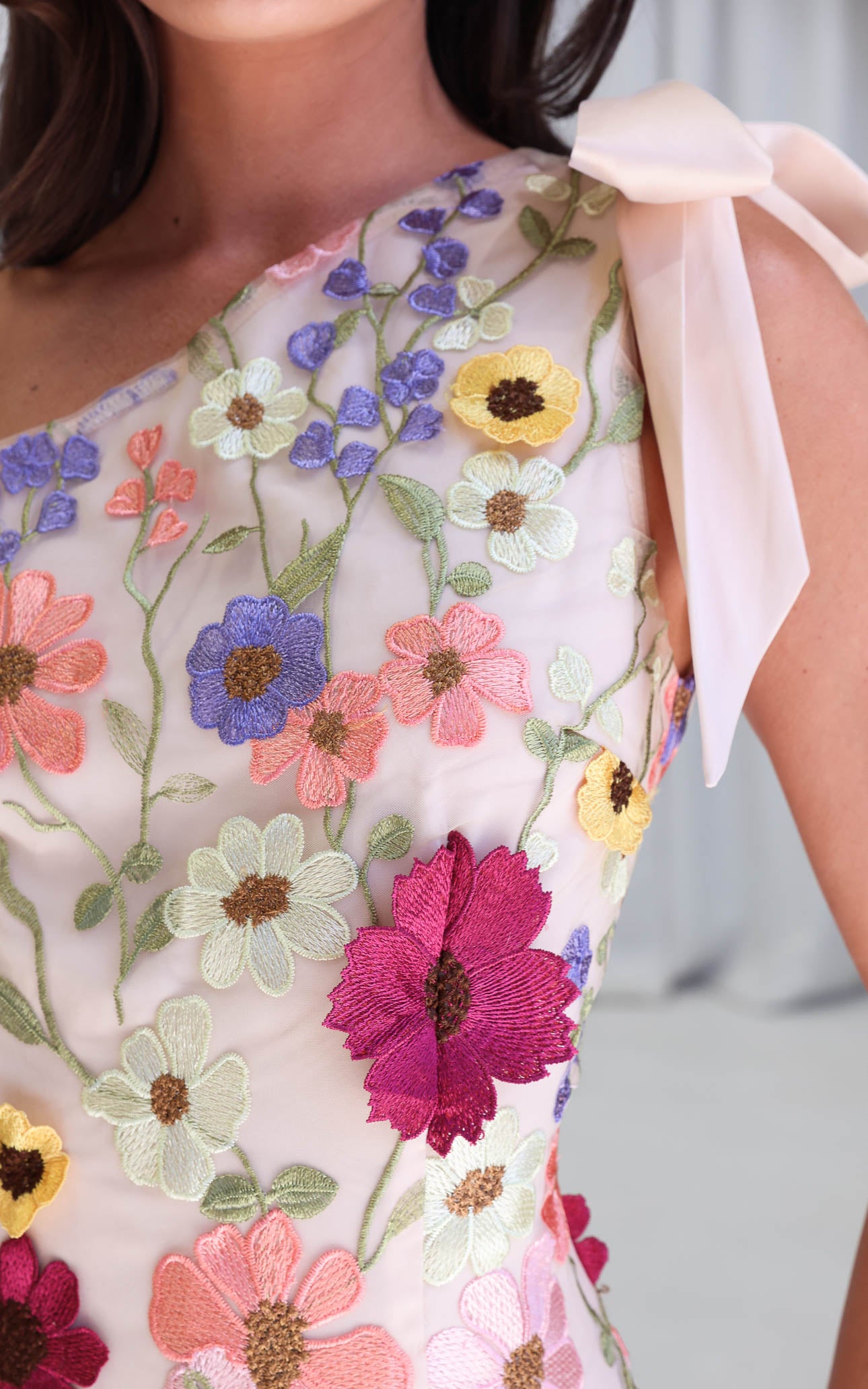 – Fixed one shoulder style with functional satin bow feature on left side