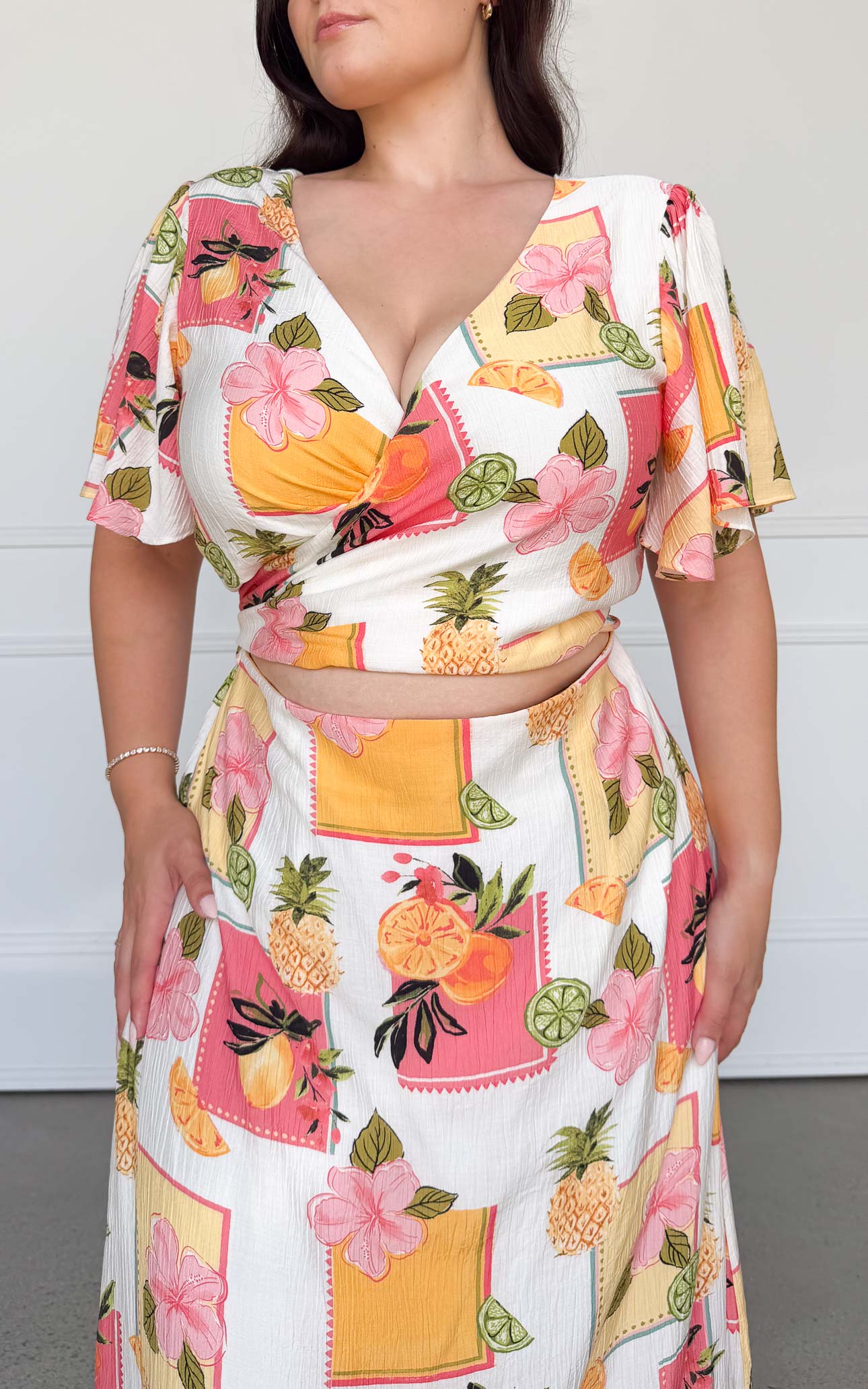 – Colour: white base with pineapple, citrus and floral print (print placement may vary with each piece)
