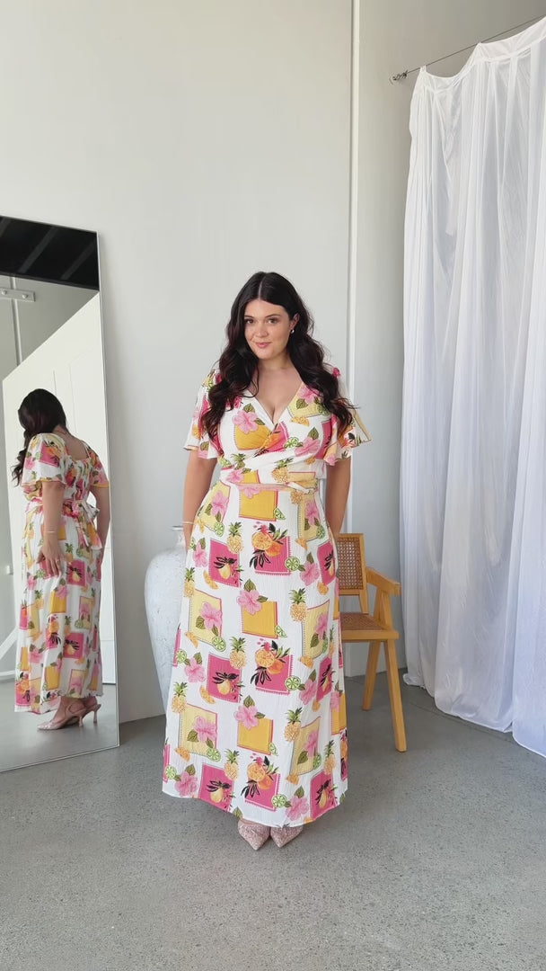 Roza Short Sleeve Maxi Dress - White Pineapple Tropical Print