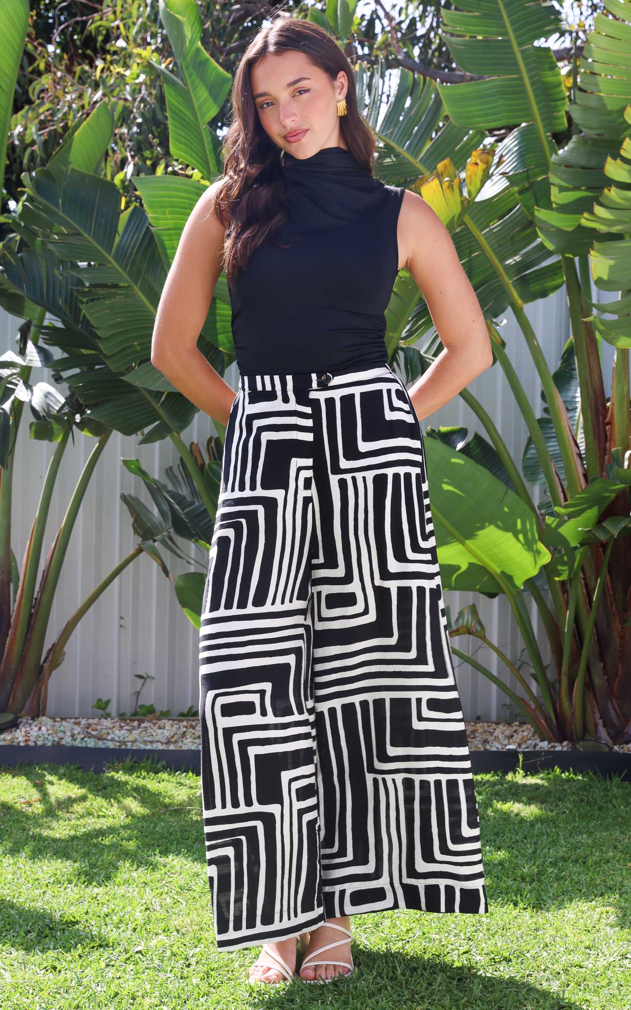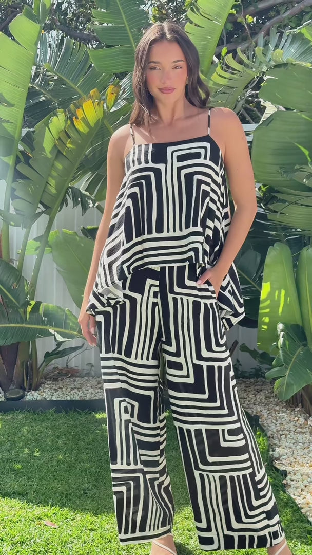 Saffron Wide Leg Pants - Black Cream Print