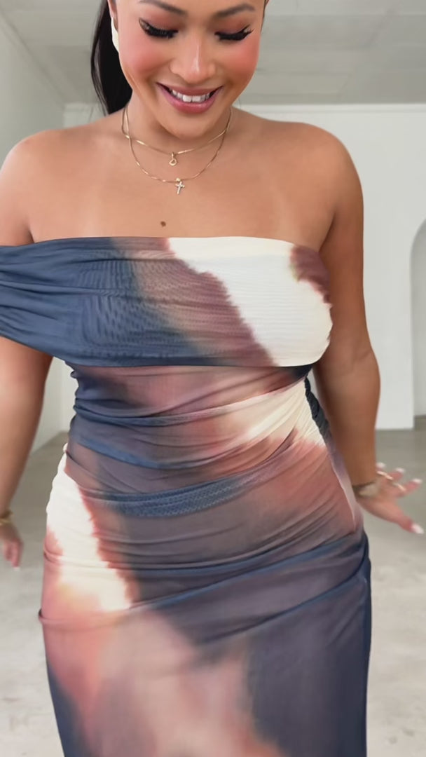 – Asymmetric off shoulder neckline (right shoulder sleeve) with bust overlay