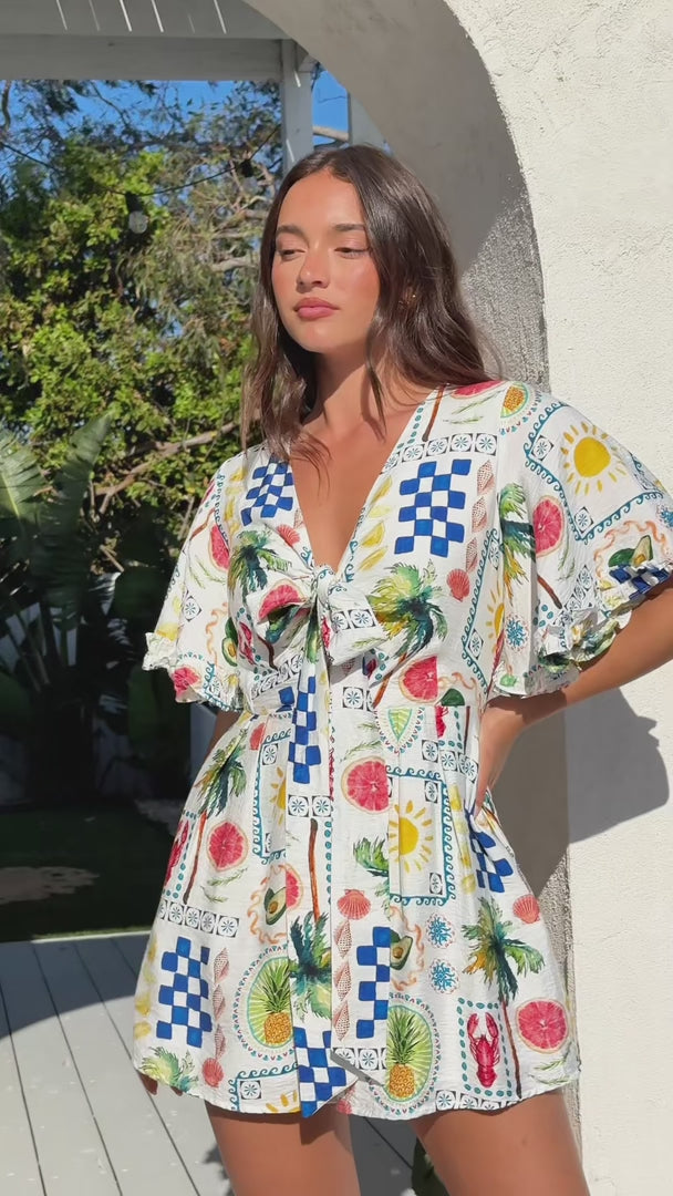 – Colour: white base with summer holiday print featuring featuring fruits, seashells, lobsters and palm trees (print placement may vary with each piece)