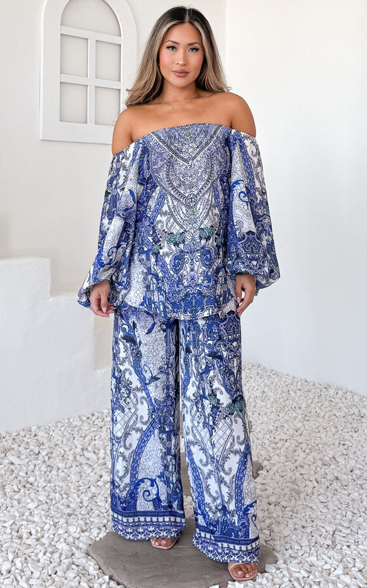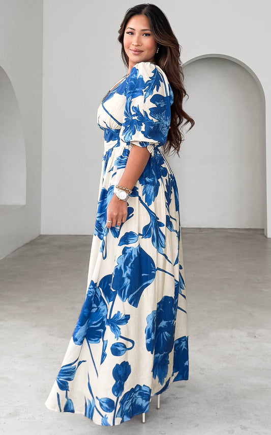 Aretha Three Quarter Sleeve Maxi Dress - Cream Blue Floral